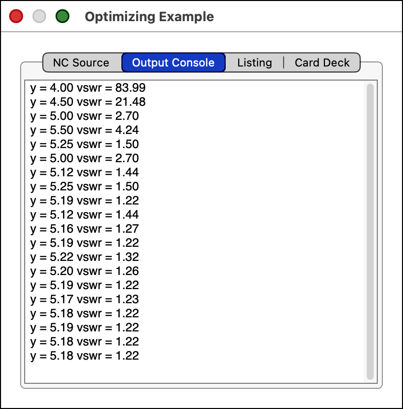 You can see that the there is a printf statement inside the repeat loop that prints the value of y and the VSWR for that value of y. As mentioned earlier, the output of the printf statement will go into the Output Console of the NC window. The following shows the Output Console after the control loop is done:
